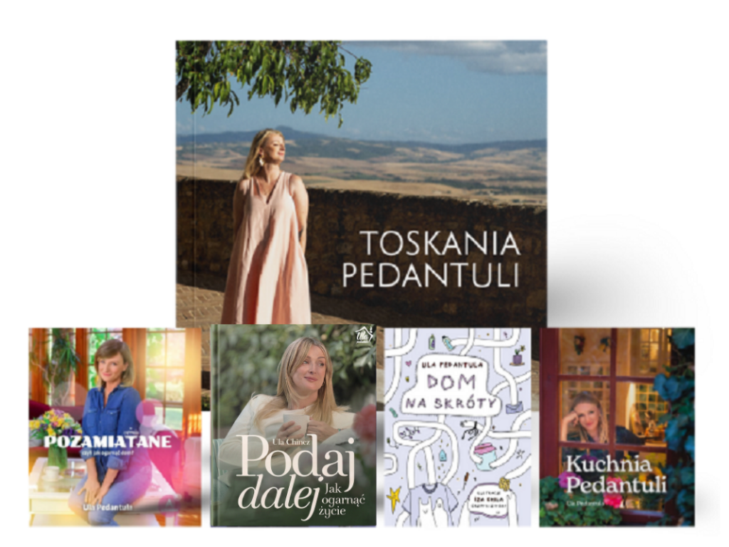 Zgarnij za jednym razem „Toskanię Pedantuli” , „Kuchnię Pedantuli”, „Pozamiatane”, „Dom na skróty” oraz „Podaj dalej„ i zanurz się w świecie Uli Pedantuli, zarówno tym „domowym” jak i „zawodowym” oraz „osobistym”!